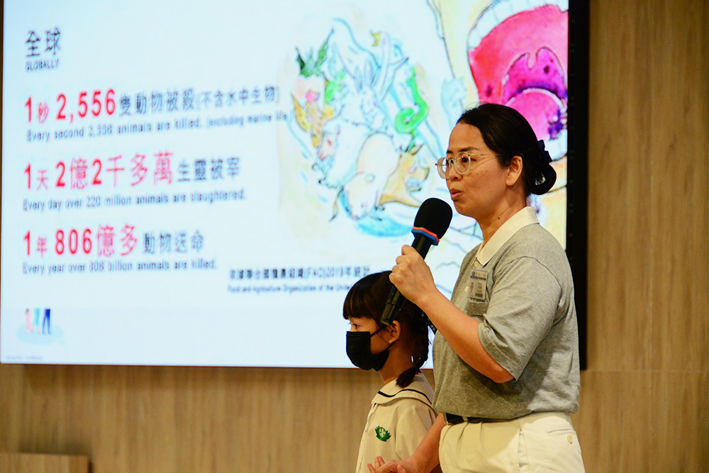 站在台上牵着小女儿,黄蔓薇用亲身经历欢喜分享自己茹素的心得。(摄/ 陈三峇)